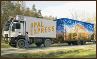 A twenty-metre-truck is on the road through Europe. The "Opal Express" transports a piece
