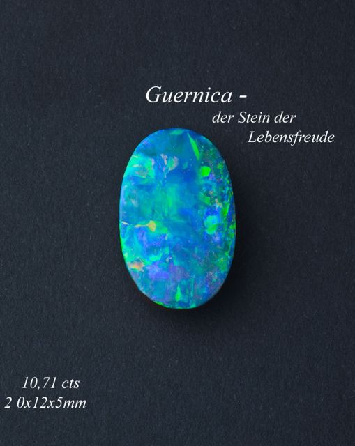 Guernica ist ein Stein der durch sein Farbenspiel Hoffnung und Gelassenheit bringt. Er sorgt auch dafür, dass man sich zur gegebenen Zeit einmal gehen lässt und das kindliche im Erwachsenen wieder geweckt wird. Das fördert auch den Energiefluss in unserem Körper, und löst somit auch Blockaden und Depressionen. Der Opal fördert das Wohlbefinden und lässt den Alltag ein wenig vergessen.