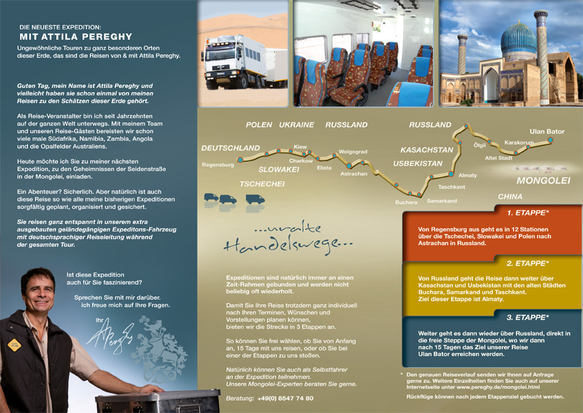 Eine Strecke, die sich über eine Länge von über 10.000 km erstreckt, verläuft durch Gebiete unterschiedlicher Kulturen, unterschiedlicher Landschaften und durch Gebiete mit einer sehr abwechslungsreichen Geschichte. Dieser Weg wurde bereits von den Hunnen genutzt, die aus den Steppen Asiens kamen und im 4. Jahrhundert bis nach Westeuropa vordrangen. Die Truppen Dschingis Khans, des Führers der vereinigten Mongolenstämme und seinen Nachfolgern gelang es im 13. Jahrhundert bis nach Liegnitz vorzudringen. Zu Beginn des 19. Jahrhunderts bewegten sich die Truppen Napoleons auf diesem Weg, um das Anspruchsdenken in Richtung Osten zu realisieren. In der jüngeren Vergangenheit waren es die deutschen Truppen, die in den Weiten der damaligen Sowjetunion ihren gedachten Lebensraum sichern wollten. Dem Leid, das die kriegerischen Eroberungen auch immer mit sich brachte, steht der Handel, der auf diesen Wegen erfolgte, gegenüber. Der Fortschritt, der sich im Mittelalter entlang der Seidenstraße entwickelte, kann man auch heute noch an der Architektur früherer Zeiten erkennen. Buchara, Samarkand, Taschkent sind nur einige Orte, die die mitteleuropäischen Menschen auch in der heutigen Zeit mit ihren alten Bauwerken verzaubern können. Der letzte Teil der Reise führt von der Westmongolei bis Ulan Bator. Dabei muss das Altaigebirge überwunden werden. Auf den Wegen, die durch wildes Gebirgsterrain, Steppe und Wüste führen, begegnet man Nomaden, die noch eine über viele hundert Jahre alte Lebensweise praktizieren. Einen Kontrast dazu bildet dann das quirlige Leben in Ulan Bator.